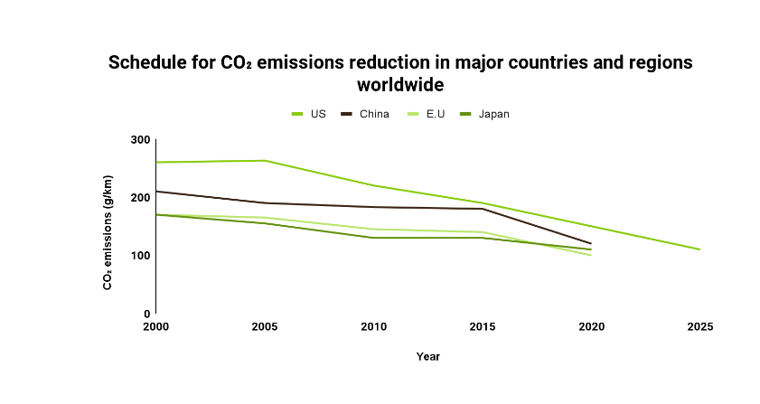 - The continuous development of emission control technologies for vehicles. The emission of harmful substances from ICEs is already approaching zero, and the emission of major pollutants has been reduced by approximately 90%. Furthermore, owing to the exacerbation of energy and environmental problems on a global scale, there is an urgent need to reduce the energy consumption of ICEs and the CO2 emissions by ICEs for the automotive industry. The CO2 emission reduction schedules for some of the major countries and regions worldwide are shown in Figure below. In China, the automobile industry has to reduce CO2 emissions from passenger cars by 5% annually.