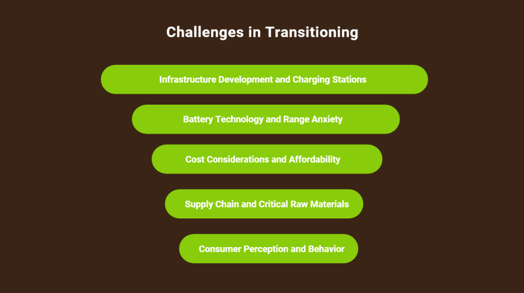 One of the primary challenges in transitioning to EVs is the limited availability of charging infrastructure. The widespread adoption of EVs depends on a robust and reliable charging station network, especially for long-distance travel. Expanding charging infrastructure requires substantial investments in public and private sectors and strategic planning to ensure adequate coverage across urban, suburban, and rural areas.