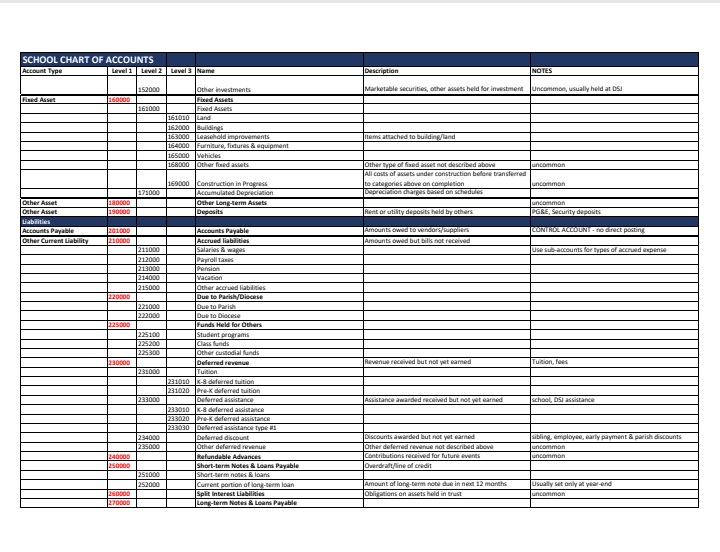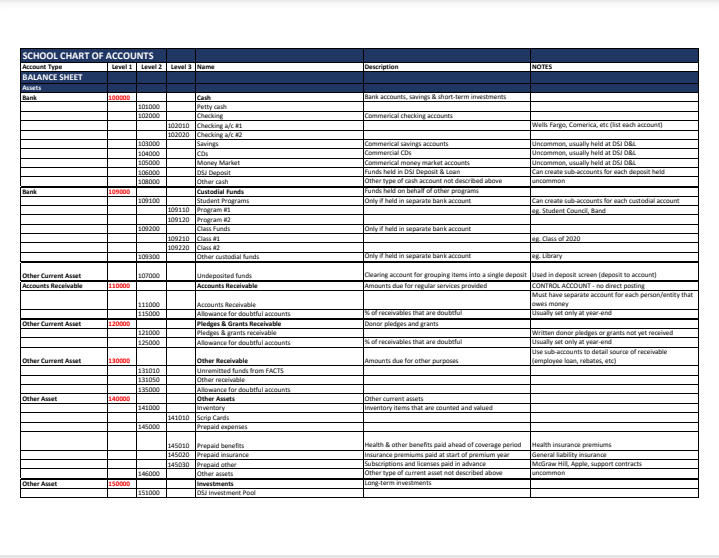 The chart of accounts for your institute should first be divided into manageable categories to facilitate easy movement within the sheet or document. The components in a typical chart of accounts list could consist of the following: