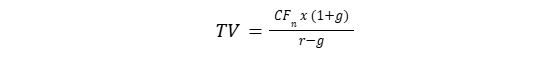 TV = terminal value at the end of the final year (n), and is calculated as: