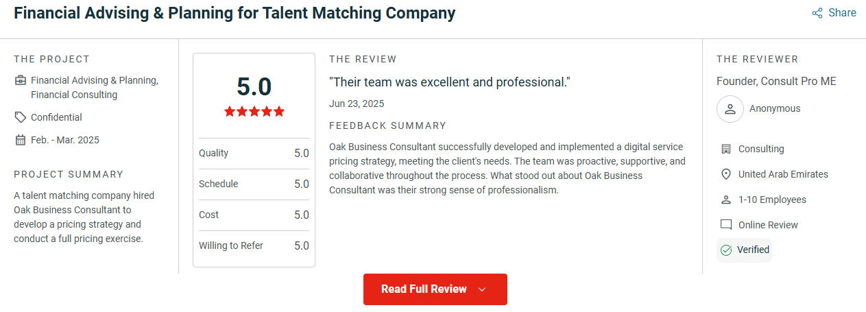 This comprehensive and dynamic pricing strategy ensured that our client’s recruitment business remained flexible, competitive, and profitable. By leveraging a diverse pricing structure, conducting competitor analysis, estimating market potential, and providing ongoing support, we helped the client successfully navigate the recruitment industry’s competitive landscape and capitalize on emerging trends in the UAE and GCC regions.Ready to Elevate Your Recruitment Business? Book your free consultation with Oak Business Consultant today and discover how our tailored pricing strategies can drive scalable growth, enhance client trust, and secure your competitive edge in the market.