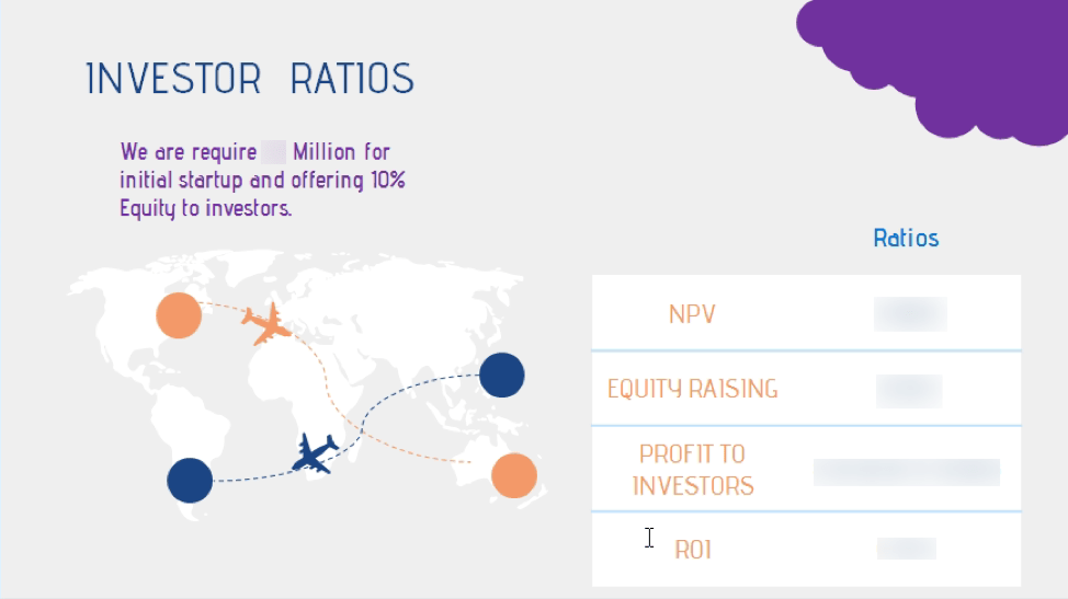 Every time an investor adds funds to a business, they want to know what they’re investing in. This pitch deck makes sure to cover the main parts of what an investor may be interested in. These include Net present value (NPV), profit, and Return on investment (ROI). Each of these holds immense importance for investors, so we took the responsibility of adding it to the pitch deck.