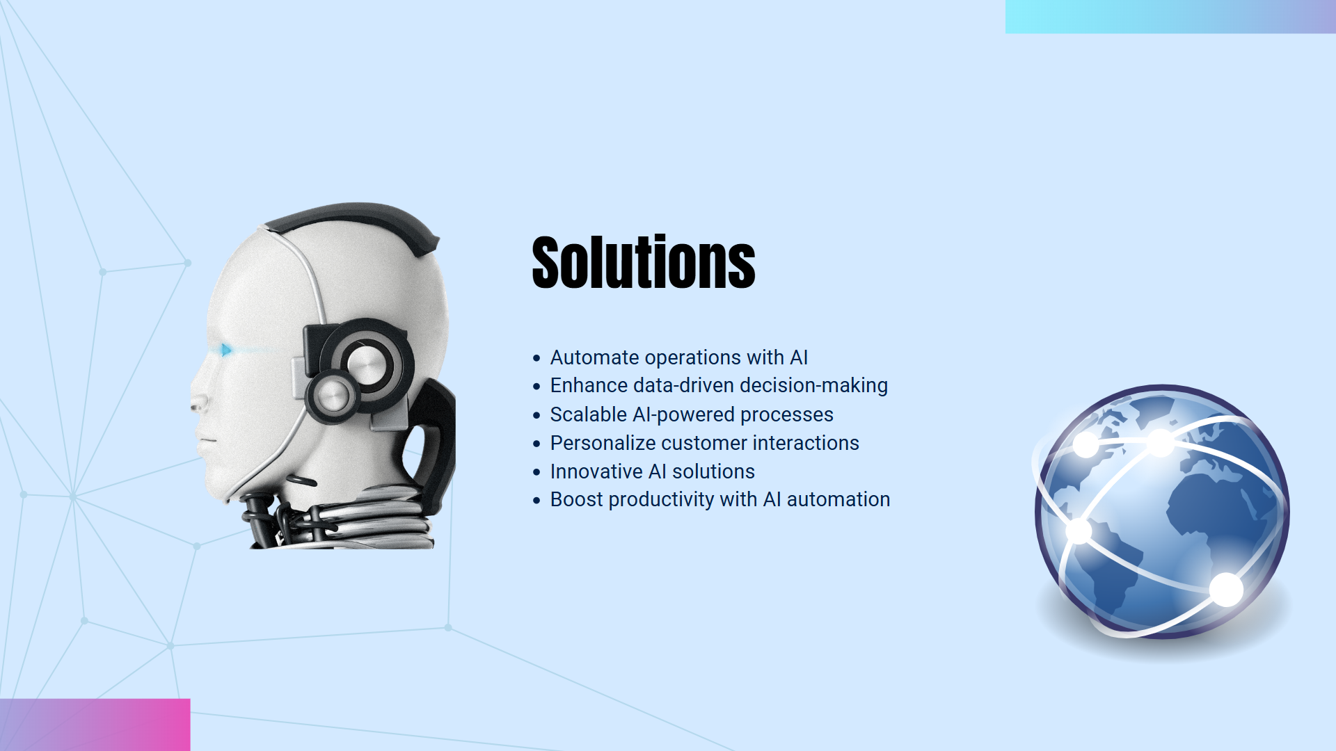 Present your AI services as the solution to the problem identified. Explain how your technology works, its unique features, and the benefits it provides. Use visuals, such as diagrams or screenshots, to illustrate your solution and make it more tangible for your audience.