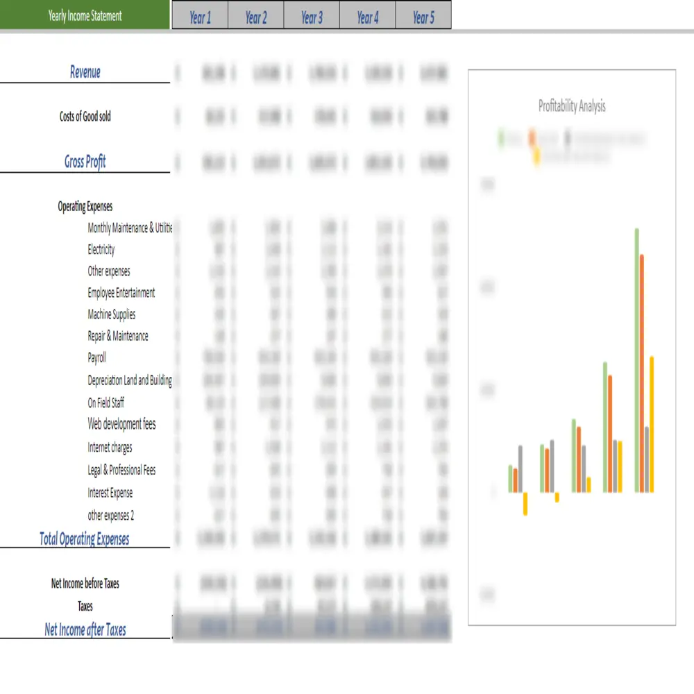 Furthermore, the Yearly Income Statement gives you complete insights into revenue and general & administrative expenses. The Yearly Income Statement also contains several graphs, assumptions, ratios, margins, net profit, earnings, cost of services, and profit after tax.