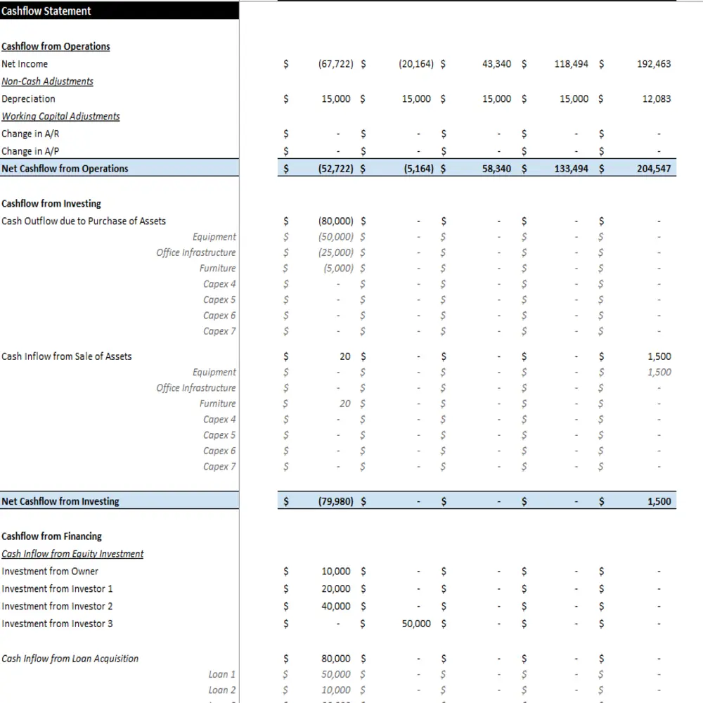 - Investing Activities: Any cash from the disposal of an asset and acquisition and investments is in this section that is linked to the inputs and fixed asset tab.