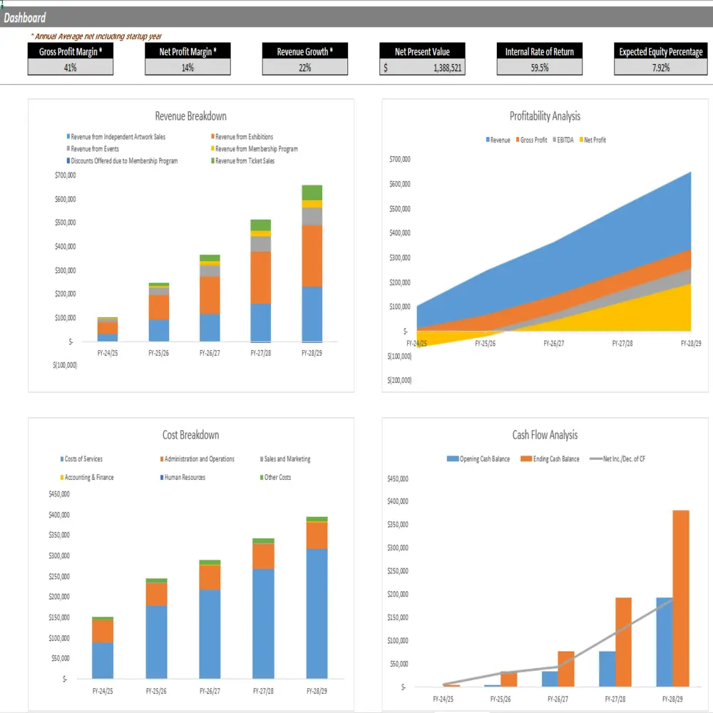 This model gave us a comprehensive financial overview of our gallery. It’s perfect for tracking art sales, exhibitions, and operational expenses