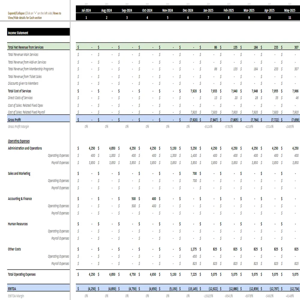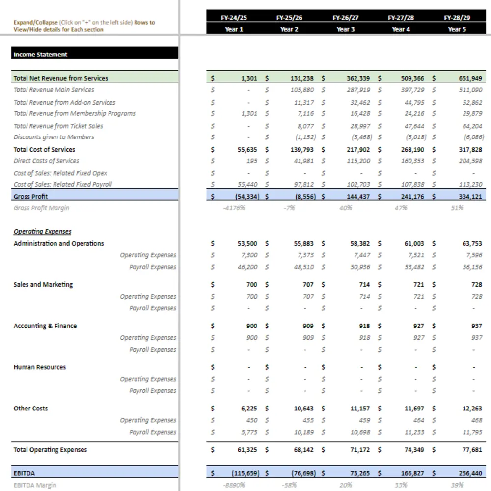 - Membership and Ticketing Revenue: Projects membership programs and ticket sales for sustainable income.