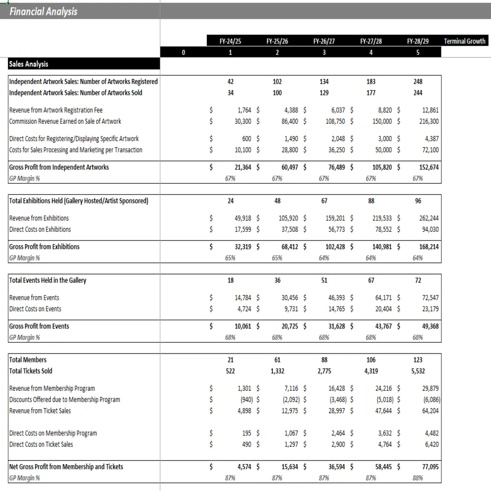 The sales analysis projects steady growth across key revenue streams, including independent artwork sales, exhibitions, events, and memberships/tickets over five years. Gross profits and margins improve year-on-year, driven by increasing revenues and efficient cost controls. This analysis highlights a balanced and diversified approach to generating sustainable financial performance.
