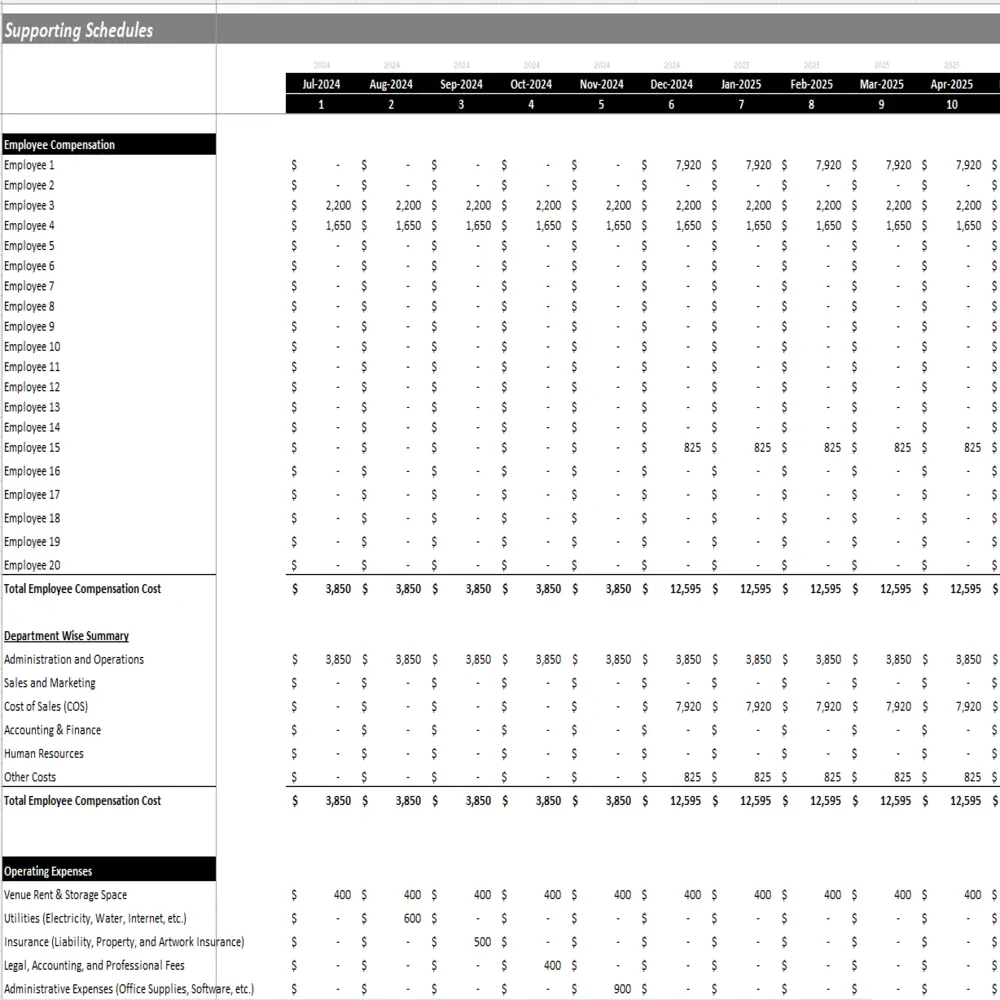 The supporting schedules outline employee compensation, departmental expenses, and operating costs. This detailed view helps in allocating resources effectively and understanding the financial structure of the business.