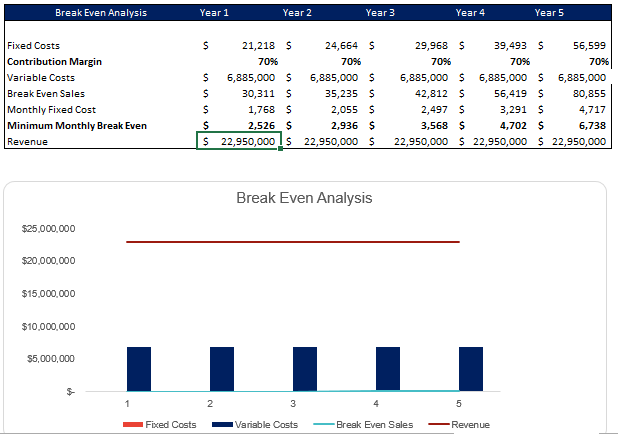 The break-even analysis tab is useful to determine the number of units and revenue required to achieve break even.