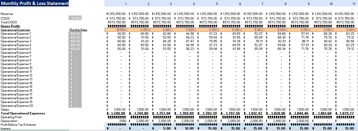 Calculations: The revenues are calculated based on the product or services sold, promotion, pricing, promotions, and marketing campaign, and deducting the business variable and fixed costs the operating profit is resulting. Based on the assets financed and the gearing of the financing, the interest and depreciation calculation is done. With the help of working capital assumptions, we have measured the impact on business cycles. The PnL Monthly tab has aggregation with relevant statements: profit and loss, balance sheet, and cash flow every month.