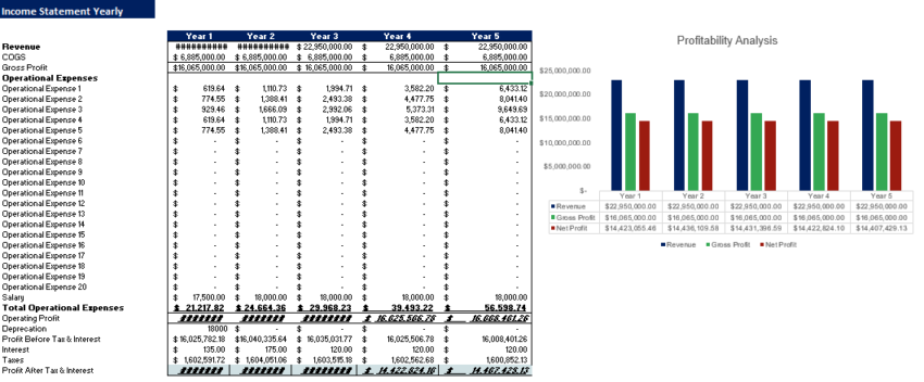 Furthermore, the Yearly Income Statement gives you complete insights into revenue and general & administrative expenses. The Yearly Income Statement also contains several graphs, assumptions, ratios, margins, net profit, earnings, cost of services, and profit after tax.
