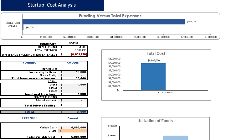 A start-up summary tab includes the total cost incurred at the start of business and capital expenditure, how much cash injected by the company so far, and based on the number of months the amount of investment required is calculated.