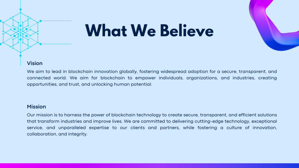 In this section of your pitch deck, articulate the unique blend of services your blockchain company offers. Begin by highlighting your expertise in hybrid blockchain development, combining the advantages of both private and public blockchains to deliver versatile solutions. Describe how your business leverages decentralized ledger technology to ensure secure and transparent operations, integrating digital ledger capabilities to enhance data integrity with immutable ledgers. Emphasize your contributions to Decentralized Finance (DeFi), demonstrating your ability to innovate within decentralized networks and develop decentralized applications that reshape financial interactions.