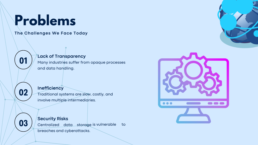 Identify and describe the specific market problems that your blockchain solution addresses. Identifying market gaps is essential to understanding where your blockchain solution can make the most significant impact. Are there inefficiencies in existing transaction systems or supply chain management that your technology can resolve? Explain these pain points clearly, using data and examples to emphasize the necessity and urgency of your solution. Successful pitch decks need to clearly state the problem that your solution is justifying.