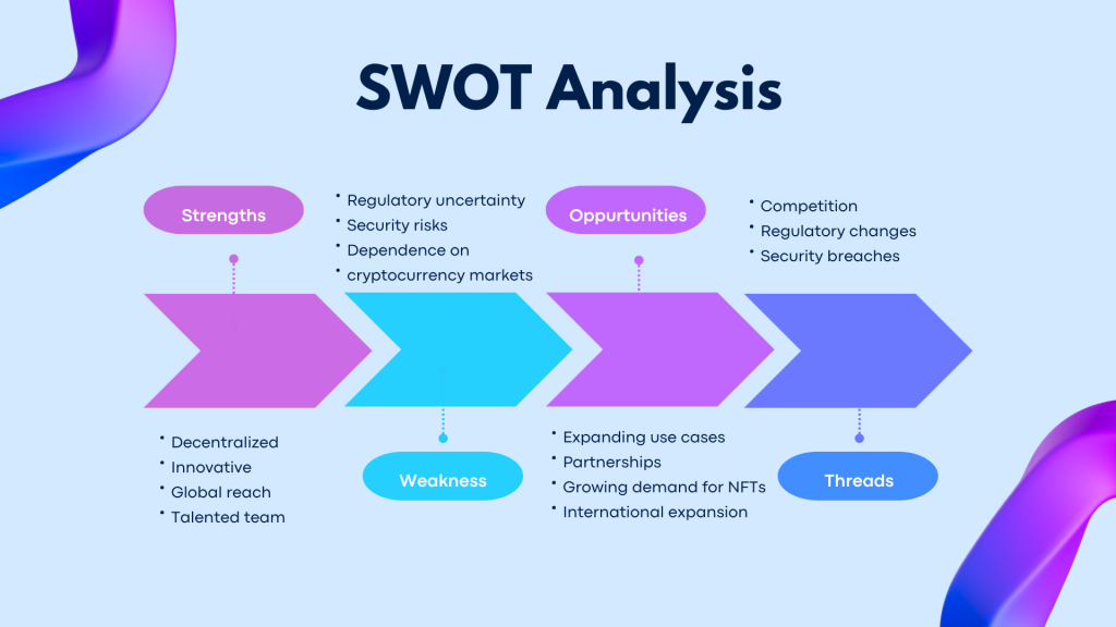 A SWOT (Strengths, Weaknesses, Opportunities, Threats) analysis provides a structured method to evaluate the strategic position of your blockchain business. A comprehensive SWOT analysis reveals our strengths in digital currency exchange capabilities and decentralized finance business applications. Significant opportunities are seen in decentralized finance business applications, leveraging blockchain to transform traditional financial systems. This analysis helps potential investors understand the internal and external factors that could impact your business’s success.