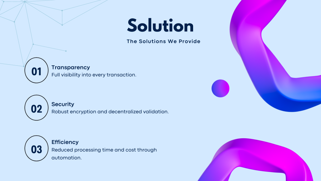 Following the problems outlined, delve into how your blockchain application serves as a remedy. Detail the technological specifics of your blockchain solution, including its architecture and consensus mechanism, and explain how these features meet the needs presented in the previous section. Identify the action plan and USP of your solution; for example, “Our blockchain architecture ensures secure interactions among communities, providing a robust solution to existing transactional inefficiencies.”