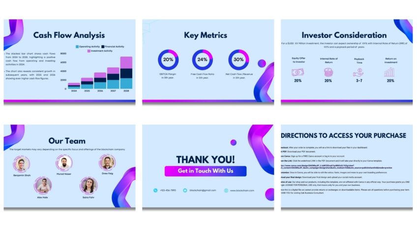 This blockchain pitch deck template features sections on company overview, problem and solution, market analysis, competitive landscape, financial model, and team. It’s designed to be comprehensive yet adaptable to different blockchain applications.