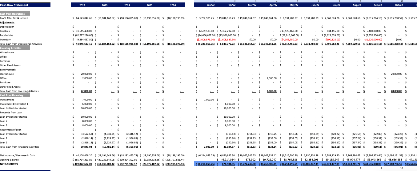 The Cashflow Statement in our Model contains a dedicated sheet to monitor and analyze your company cash-ins and out. This cash flow statement is based on several key inputs: Payable and Receivable Days, yearly income, working capital, long-term debt, net cash, etc. This calculation computes your net cash flow and beginning and end cash balances. This is a perfect template for your Company’s cash flow management.