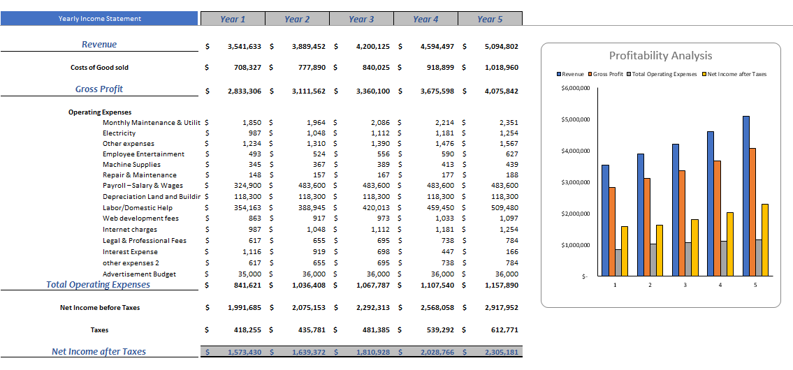 Furthermore, the Yearly Income Statement gives you complete insights into revenue and general & administrative expenses. The Yearly Income Statement also contains several graphs, assumptions, ratios, margins, cost of services, and profit after tax.