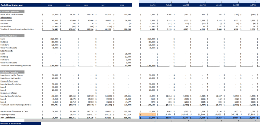 A poultry farm’s financial success depends on effectively managing profitability KPIs, cash flow projections, and operational costs. The financial statements included in the model ensure a clear cash flow analysis, covering: