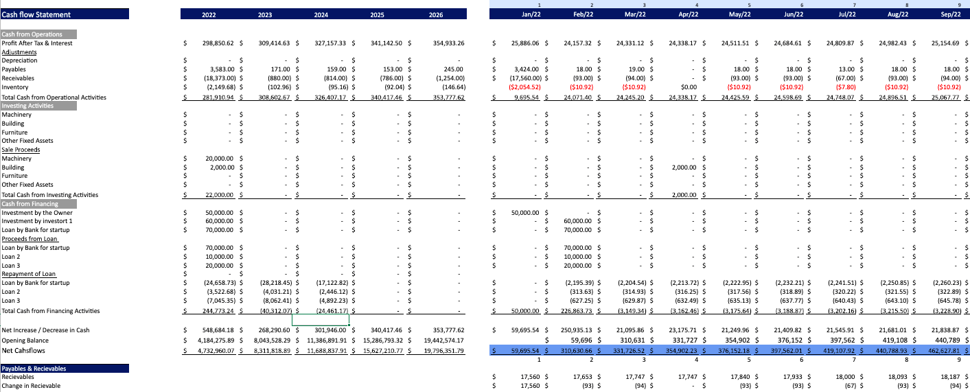 The Cashflow Statement in our Model contains a dedicated sheet to monitor and analyze your company cash-ins and out. This cash flow statement is based on several key inputs: Payable and Receivable Days, yearly income, working capital, long-term debt, net cash, etc. This calculation computes your net cash flow and beginning and end cash balances. This is a perfect template for your company’s cash flow management.