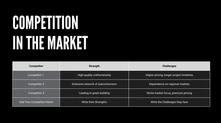 A Construction Company pitch deck is important to attract potential investors. The pitch deck is an opportunity to provide an overview of your business and what makes your business unique. It is a way to show the strengths of your business. This pitch deck will help investors know about your business and why they should invest in your business idea.