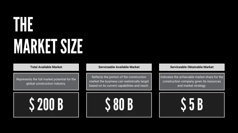 We have included its Section in the pitch slides where you quickly calculate the total available market of your business, serviceable available market, and service obtainable market.