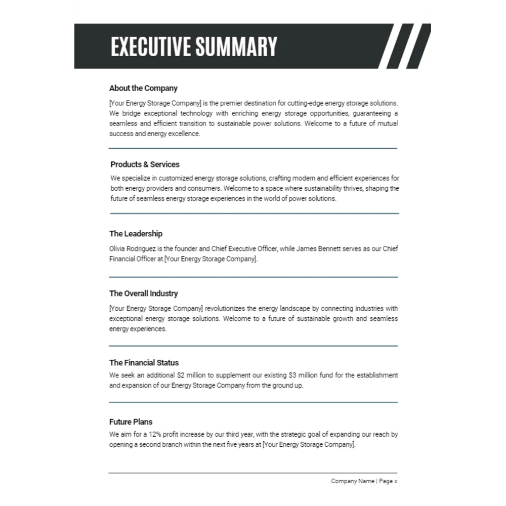 The Executive Summary section is vital for presenting a concise yet compelling overview of your venture in the energy storage industry. Begin with a brief introduction, showcasing your passion for sustainable energy and dedication to providing exceptional solutions to customers. Highlight your vision and values, emphasizing your commitment to promoting renewable energy integration and fostering a community of eco-conscious consumers.