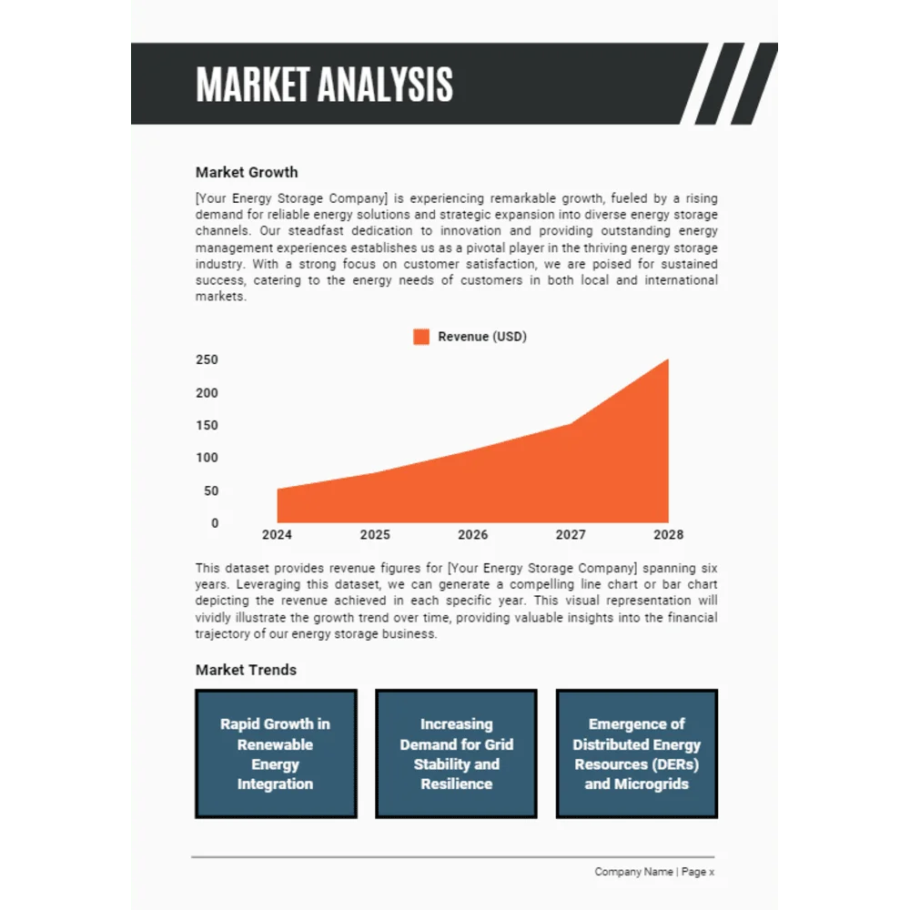 In the Market Analysis section, delve into the specific segments of the energy market that your energy storage company will target. Explore demographics, psychographics, and geographic considerations to identify your target audience and their purchasing behaviors. Highlight market trends, such as the increasing adoption of renewable energy sources or the rise of smart grid technologies, to demonstrate the market opportunity.
