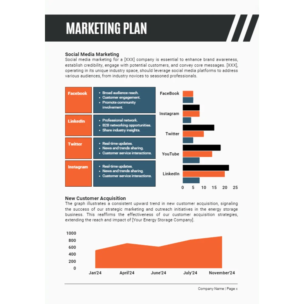 Outline your Marketing Plan, detailing how you will attract and retain customers for your energy storage solutions. Define your brand positioning, marketing channels, promotional campaigns, and customer acquisition strategies to drive awareness, engagement, and sales in the highly competitive energy market.
