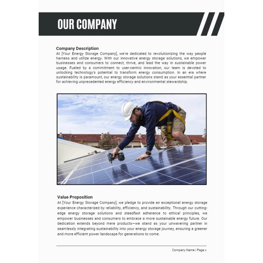 The About Our Company section is vital for presenting a concise yet compelling overview of your venture in the energy storage industry. Start with a brief introduction, providing insight into the origins and mission of your company. Highlight your vision and values, emphasizing your commitment to customer satisfaction and energy innovation.