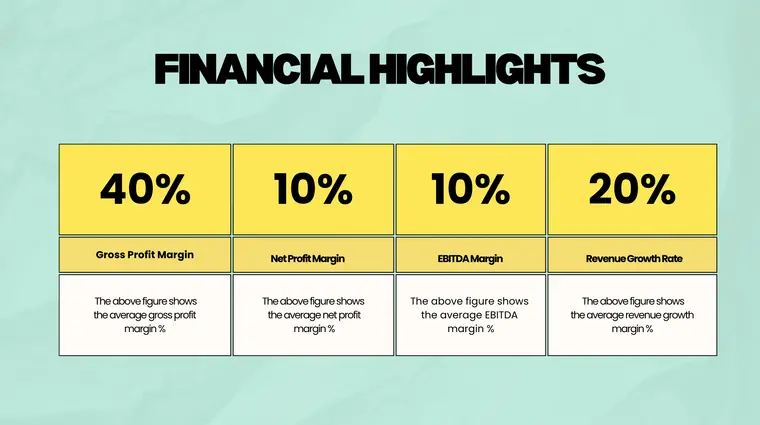 Present financial highlights that facilitate a comprehensive understanding of your venture’s fiscal health. It’s the numbers that speak volumes about your financial prowess.