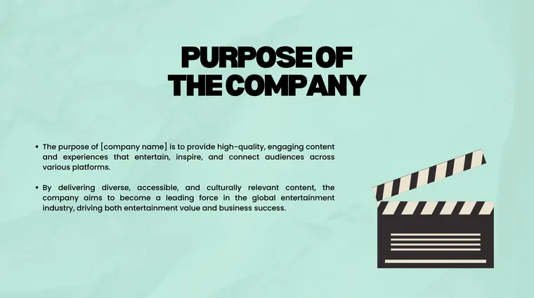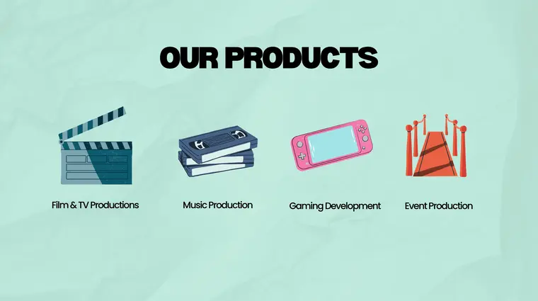 The heart of your entertainment business lies in the services or products you offer. Bring them to life with visual elements that enrich your presentation, making it not just informative but visually engaging.