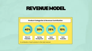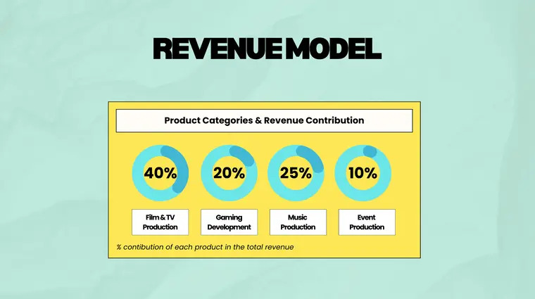 The revenue model in the Entertainment Business Pitch Deck Template is tailored to align with audience preferences and leverage analytics, incorporating an elevator pitch slide. Strategic use of social media platforms is integrated into the creation process, enhancing the potential for success. By understanding demographic shifts and fostering potential partnerships, this dynamic model adapts to market dynamics, ensuring sustained success and profitability.
