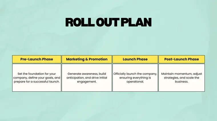 Elaborate on your meticulous roll-out plan, replete with a forward-thinking approach to market penetration that resonates with potential investors. It’s your roadmap to success.