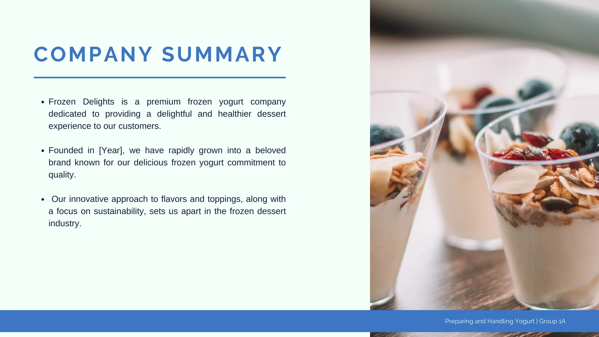 Every business has a story. Your Company Summary is where you share the origins of your self-serve frozen yogurt shop, the inspiration behind it, and the team that’s driving its success. Discuss your dairy products, emphasizing the quality and wide range of frozen yogurt varieties and toppings.
