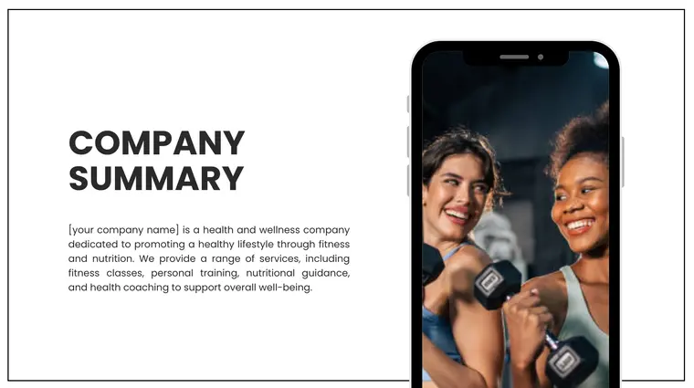 The company summary provides an overview of your business. This is where you introduce the founder, the development company (if applicable), and the core idea behind your fitness mobile application. Be sure to explain when the company was founded, the app-building process, and the services or products it offers to its target customers.