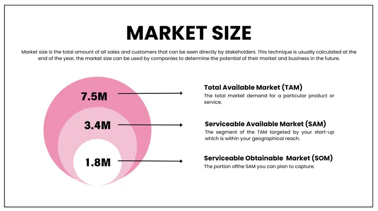 We have included its section in the pitch slides where you quickly calculate the total available market of your business, serviceable available market, and service obtainable market.