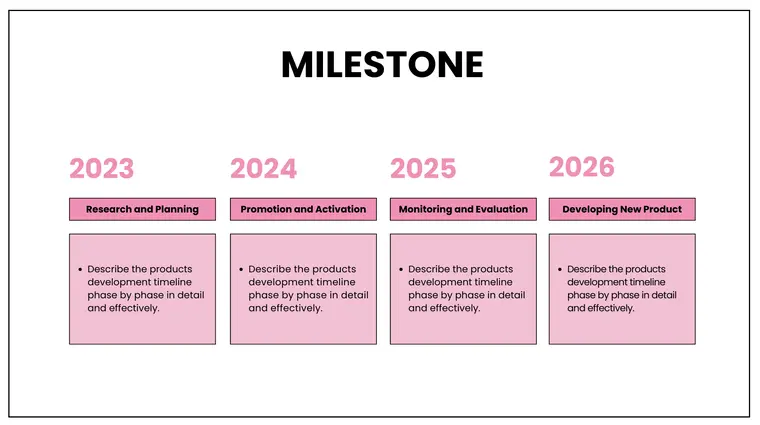 This section outlines your app’s progress so far and your future goals, along with its future objectives. Focusing on significant achievements such as the completion of development phases, beta testing, or hitting specific download targets. In addition, we have included a chart section that can show your business growth and help potential investors invest in your business.