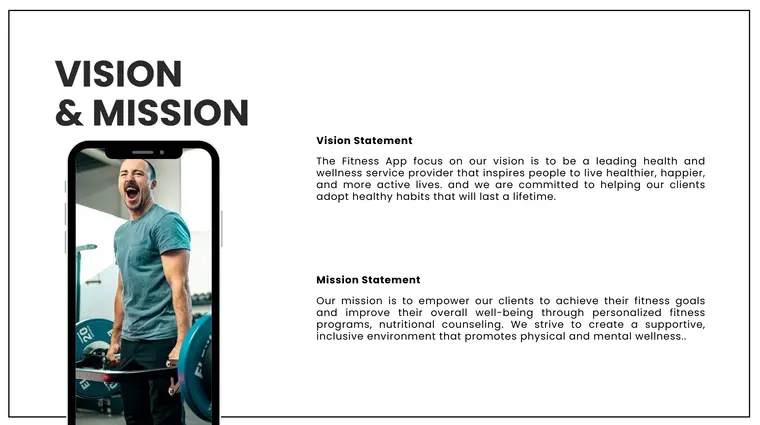 Vision and mission statements are vital for attracting aligned investors. Your vision should reflect the purpose of your fitness app. For example, “To become the leading platform empowering people to lead healthier lives through personalized digital fitness experiences.”