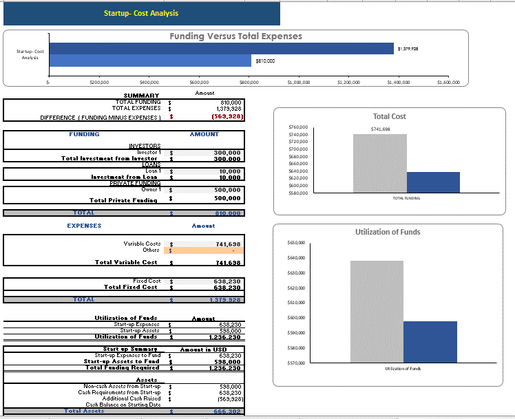 A start-up summary tab includes the total cost incurred at the start of business and capital expenditure, how much cash injected by the company so far, and based on the number of months the amount of investment required is calculated.