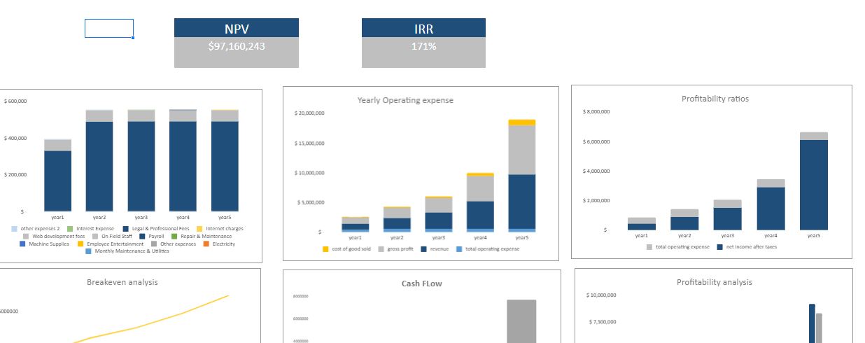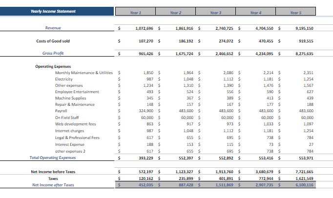 Furthermore, the Yearly Income Statement gives you complete insights into revenue and general & administrative expenses. The Yearly Income Statement also contains several graphs, assumptions, ratios, net profit, cost of services, and profit after tax.