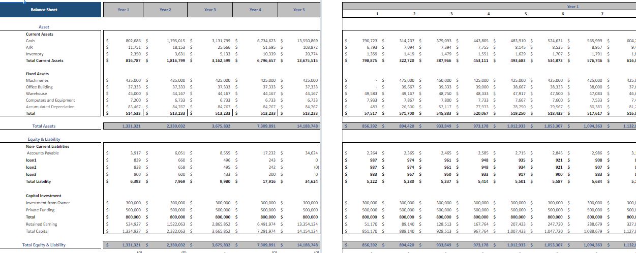 The Cashflow Statement in our Model contains a dedicated sheet to monitor and analyze your company cash-ins and out. This cash flow statement is based on several key inputs, such as Payable and Receivable Days, yearly income, working capital, long-term debt, net cash, etc. This calculation then computes your net cash flow and beginning and end cash balances. This is a perfect template for your company’s cash flow management.