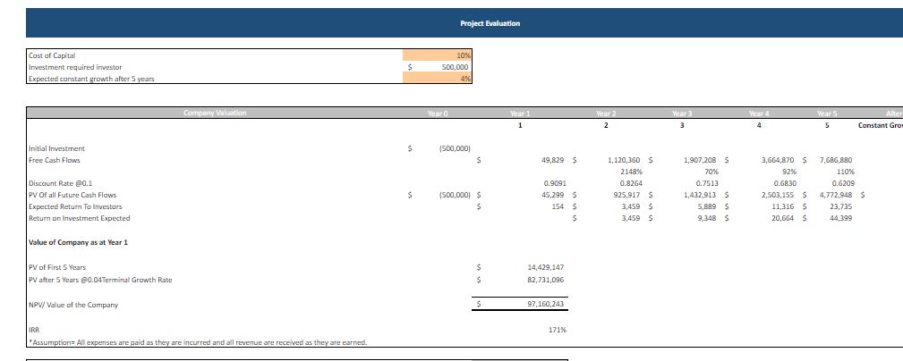 Moving to the Project Valuation tab, a company valuation is performed by using the free cash flows with discount rates to the firm and then a series of investment metrics are presented (IRR, NPV, ROE).