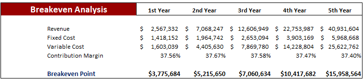 We have included a Break-even analysis in our Financial Model, which will help the user determine sales. The break-even analysis will help you know at a glance the profits generated at the various sales levels. The Break-Even Analysis refers to the point where your total sales contribution refers to fixed cost at zero profit and loss. This Technique is primarily based on marginal costing, which behaves differently at various levels of output activity.