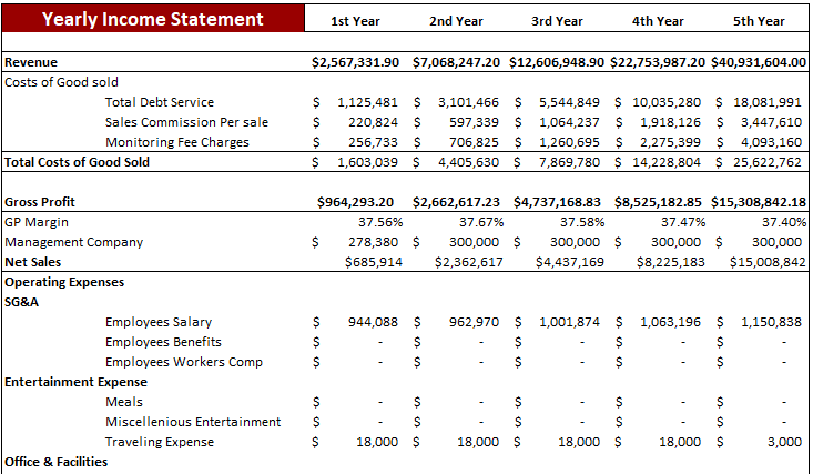 Furthermore, the Yearly Income Statement gives you complete insights into revenue and general & administrative expenses. The Yearly Income Statement also contains several graphs, assumptions, ratios, margins, net profit, earnings, cost of services, and profit after tax.