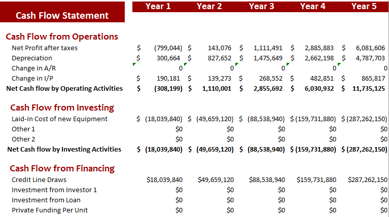 The Cash Flow Statement tab shows the cash flows from various sources. Operating Cash Flow from this sheet is used in the Project Valuation sheet. In the Project Valuation sheet, free cash flow to the firm is calculated by discounting future Cash Flow at the discount rate.
