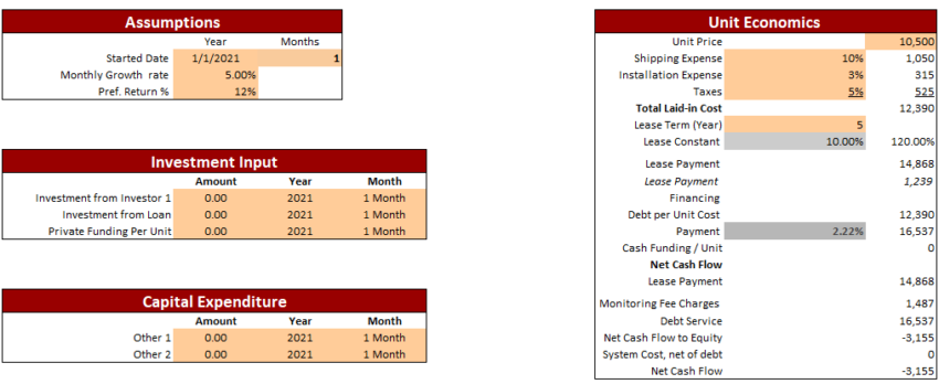 A brief overview of the Product-Based Leasing Excel Financial Model will start from the Input section, where the project-related inputs are specified.
