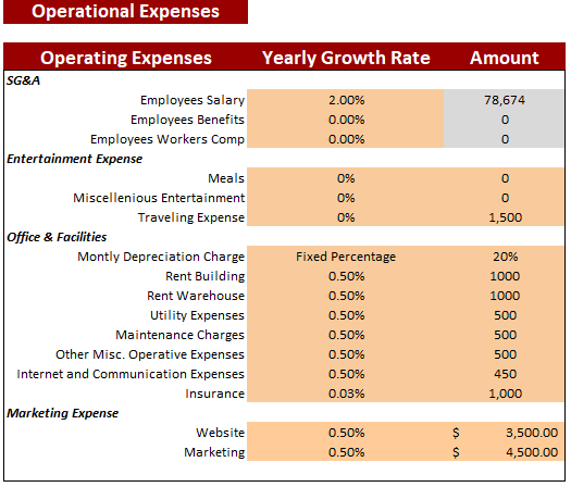 The assumptions are related to the projections of the fixed and variable expenses in the operational expense sheet. The data here is set by the user itself, altering later on if desired.